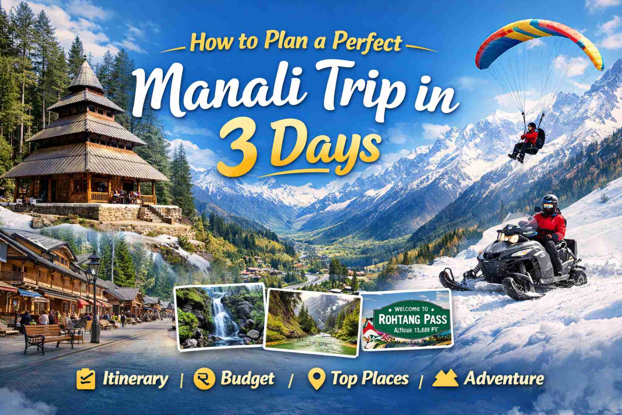 Planning a 3-day trip to Manali is easy if you follow a structured itinerary. From exploring temples and cafes in Old Manali to enjoying adventure sports in Solang Valley and breathtaking mountain views at Rohtang Pass, Manali offers the perfect mix of relaxation and adventure.